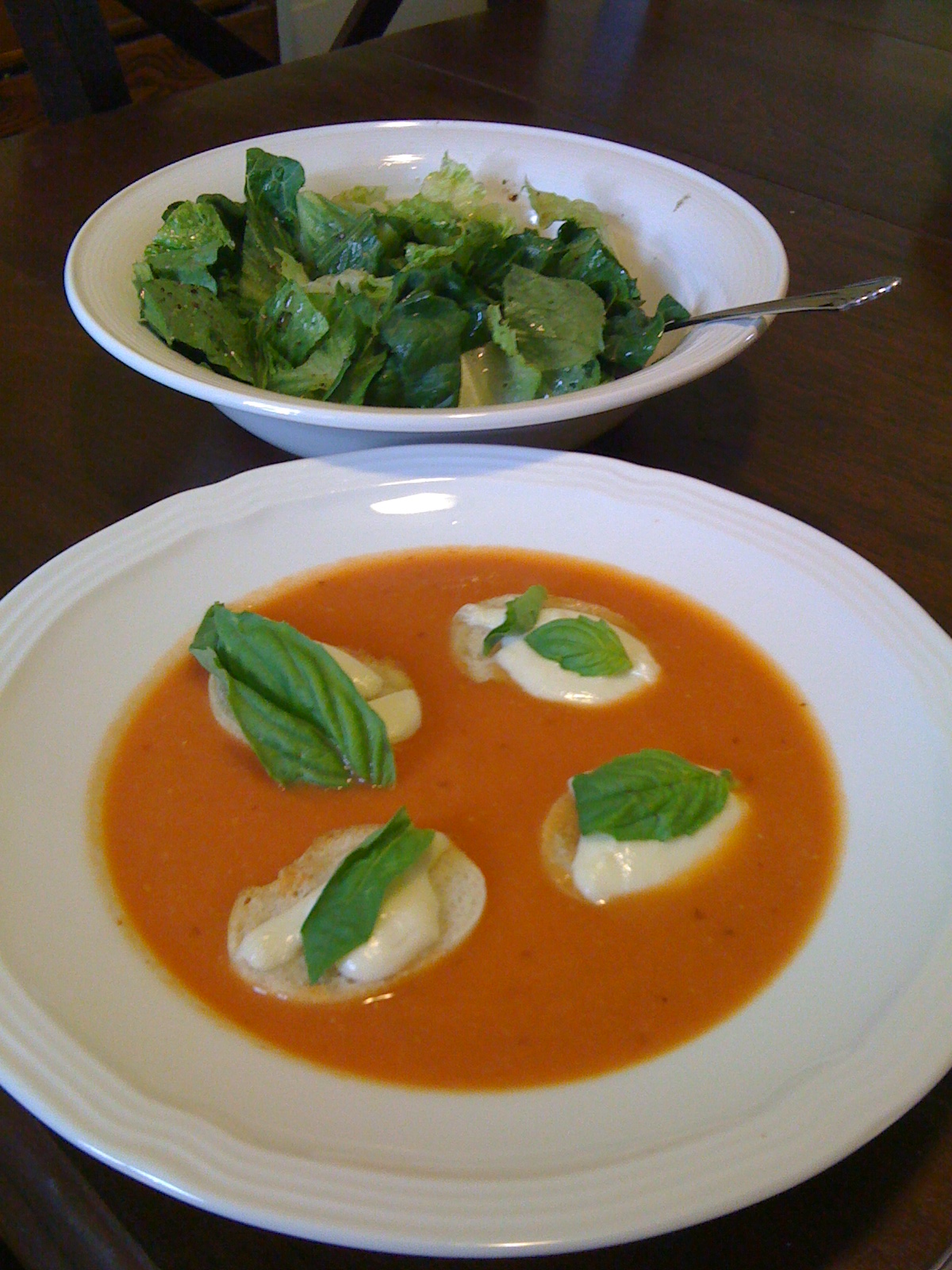 When Heather is sick, she craves tomato soup and a grilled cheese sandwich. One day when I didn’t have a can of soup on hand, I had to improvise and discovered this spicy homemade version which delivers robust taste and delicious croutons which float on top, combining the favorite flavors she wants. Although I’ve never even liked tomato soup before, this recipe even had my taste buds doing the happy dance. Serve it with a Market Salad for a complete meal.