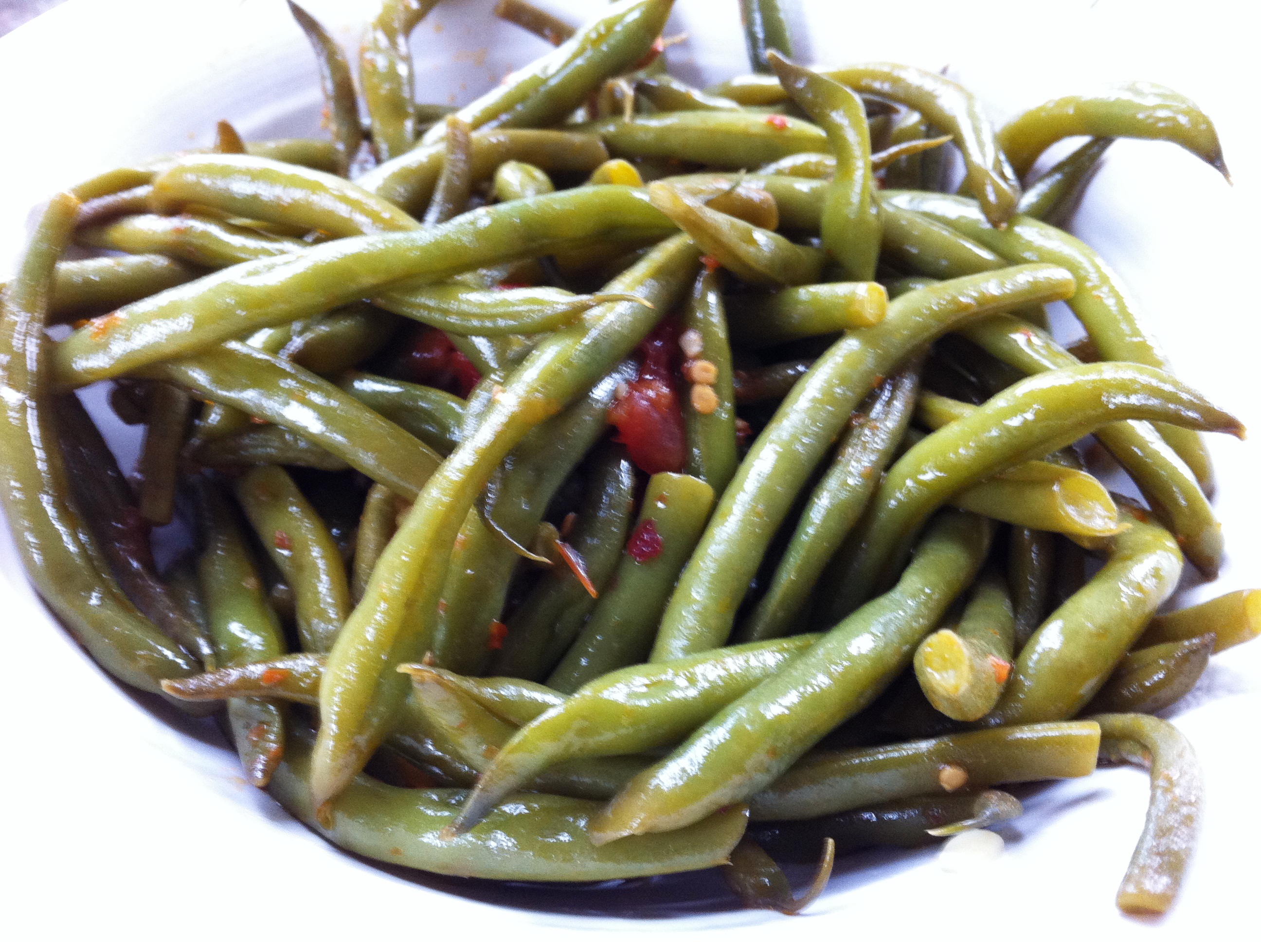 - Rinse and drain green beans. Place beans in medium saucepan while still slightly wet. Add garlic, red pepper flakes, salt, tomato and oil. Cover, cook over medium-low heat, stirring occasionally, until beans are soft, about 15 minutes.