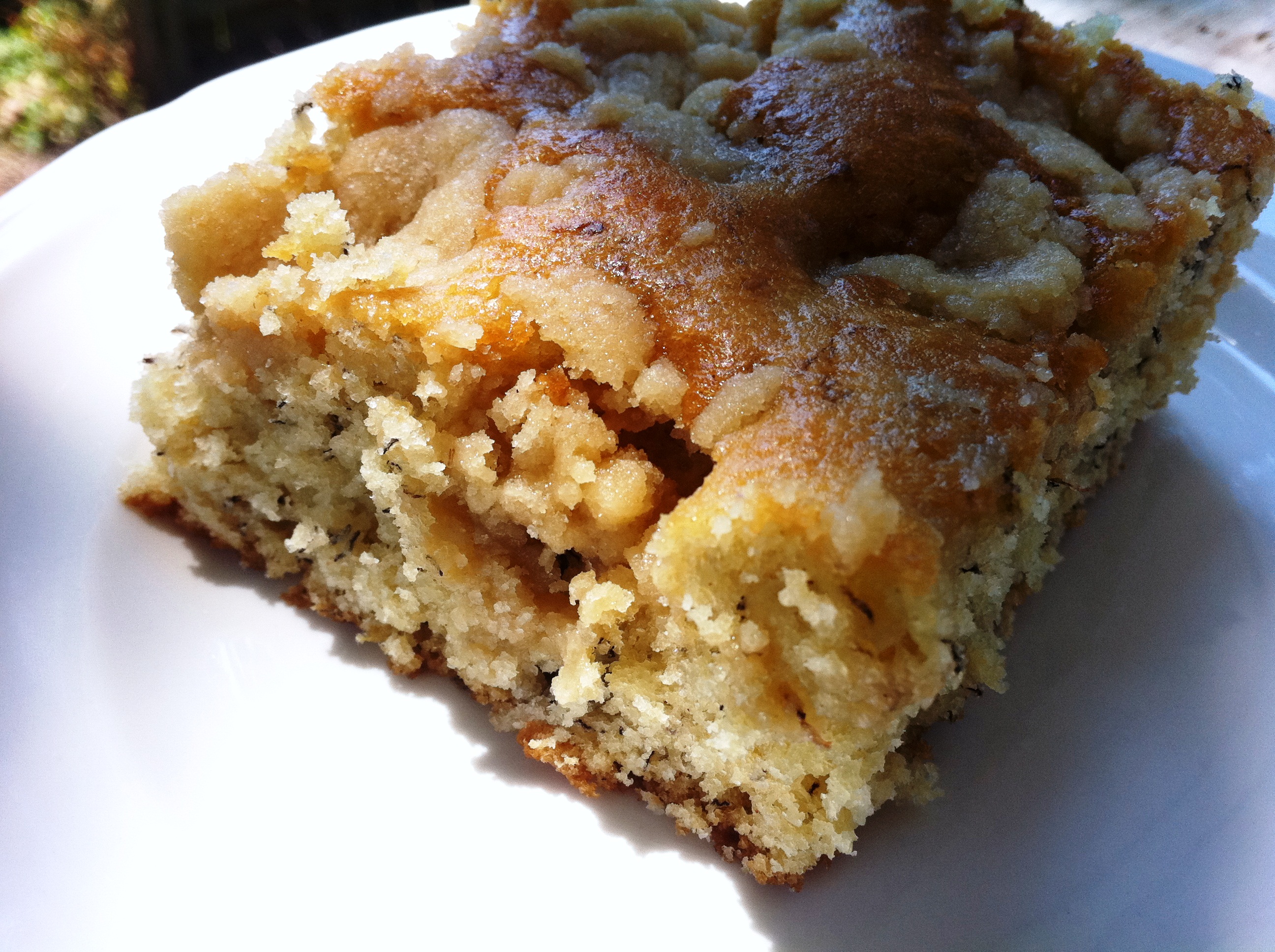 3. To make the topping, squeeze the flour, brown sugar and butter together with your hands. Crumble the topping evenly over the batter. Bake for 35 to 40 minutes. When the cake is done, an inserted toothpick or fork should come out clean from the center.