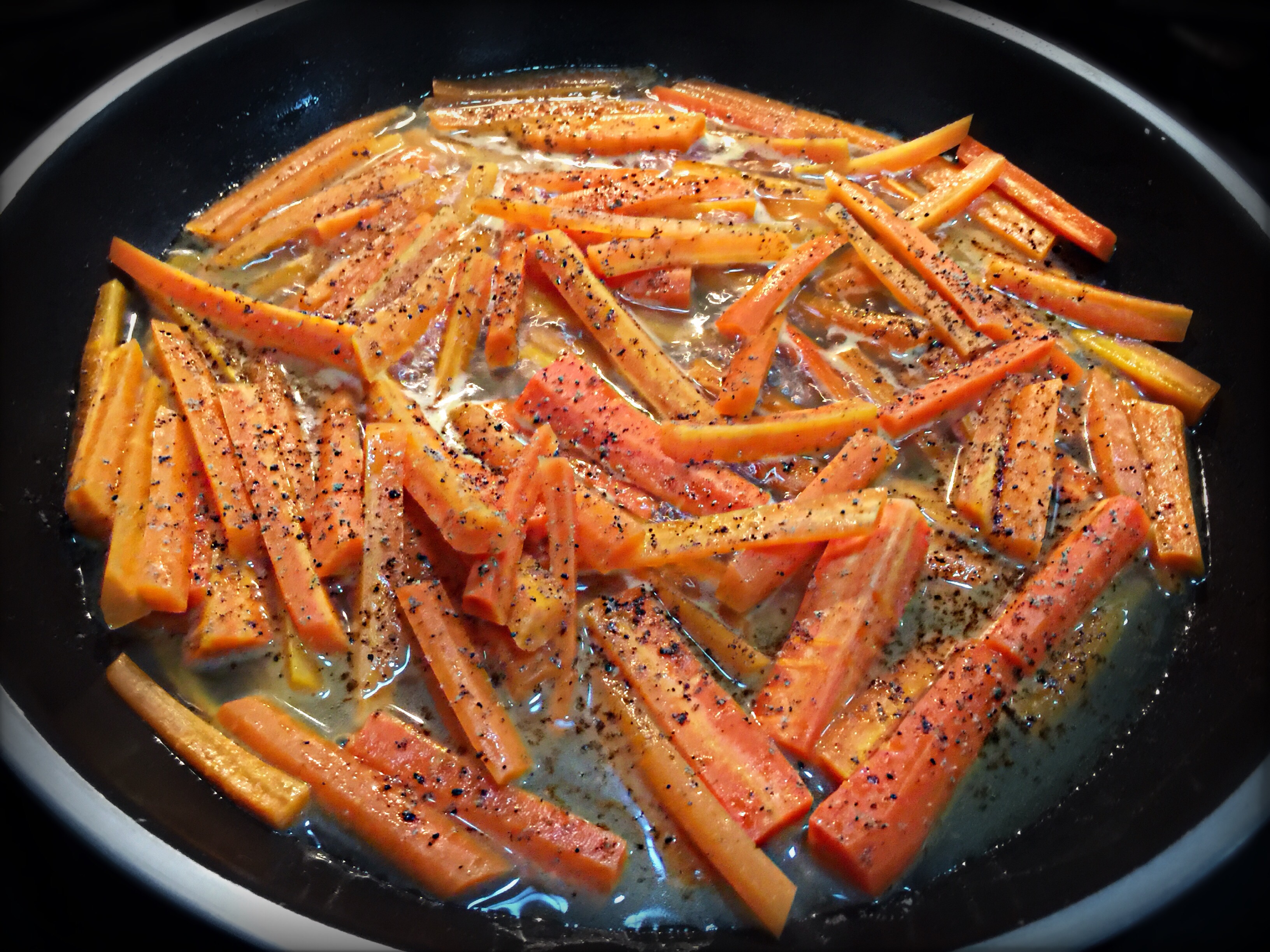 - In a skillet, bring carrots, sugar, 1/2 cup water, butter, and salt to a boil. Reduce heat and simmer, partly covered for about 20 minutes.