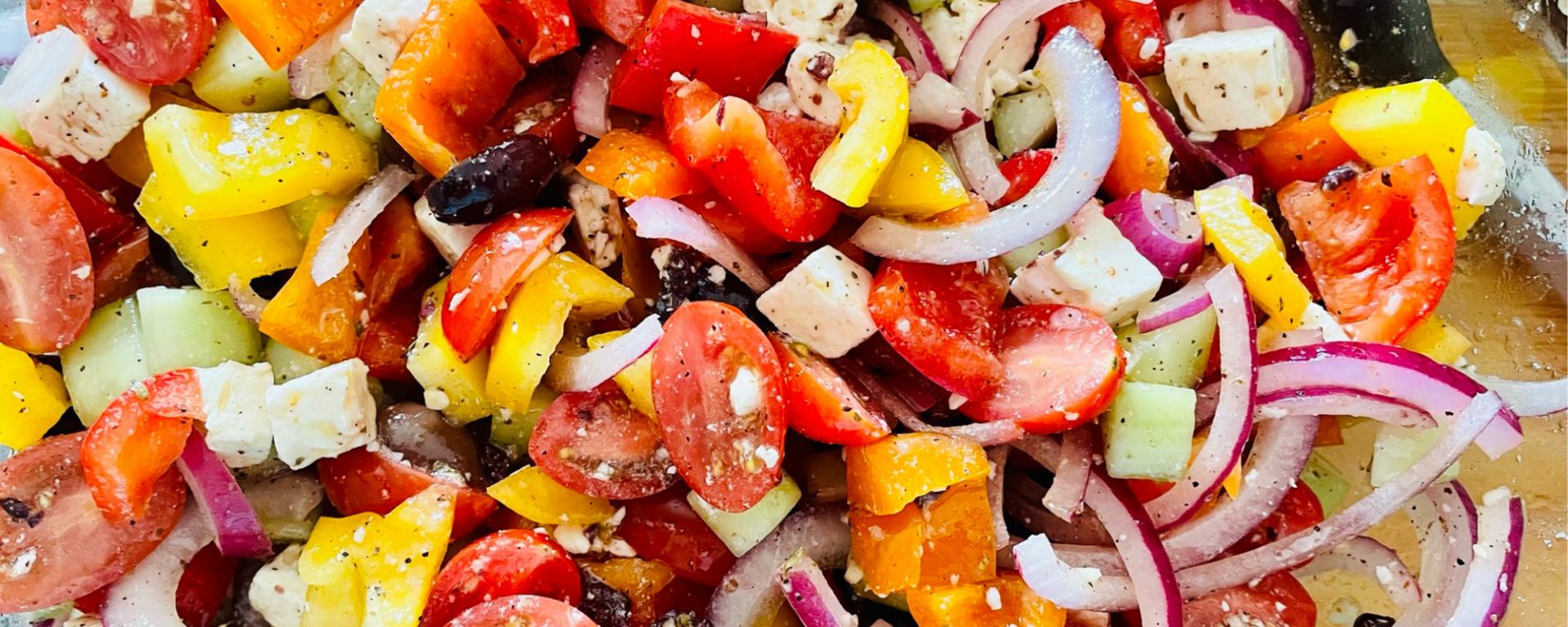 We love Mediterranean food and Greek salad is one of our favorite dishes. It is just so colorful, delicious and flavorful, it makes eating a plate full of healthy goodness easy to do, even for those who normally don’t like to eat vegetables. Many Greek salads are made with lettuce, but by replacing the leafy greens with more substantial peppers, this dish has a longer shelf life and lasts for several days in the fridge, making it a great choice to pack in lunches for work, school, or even a family picnic. We hope you try this dish enjoy it just as much as we do!